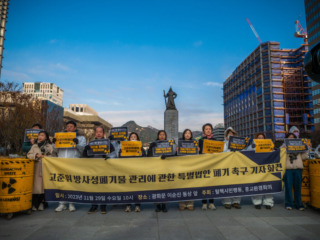 11월 29일(수) 10시, 한국YWCA연합회와 함께하는 탈핵시민행동과 종교환경회의는 서울 광화문 이순신 동상 앞에서 ‘고준위방사성폐기물 폐기 촉구 기자회견’을 진행했다. 국회에서는 예정대로라면 올해 고준위방사성폐기물특별법(이하 ‘고준위 특별법’)이 논의될 예정이었다. 그러나 안건은 상정되지 않았고, 언론에서는 여야의 이견이 좁혀지지 않아 지도부 간 협의에서 논의하자는 이야기가 나오고 있다.