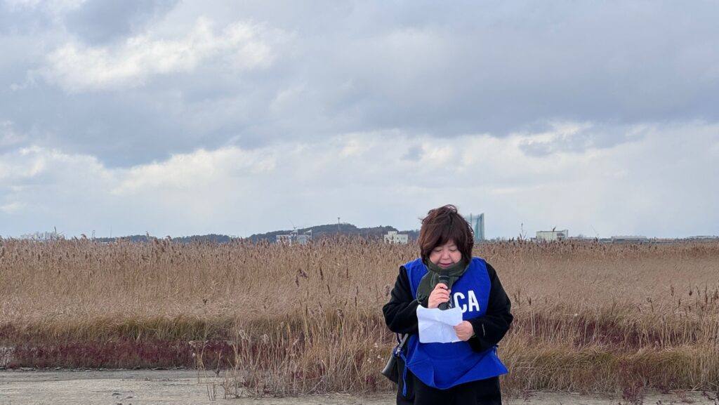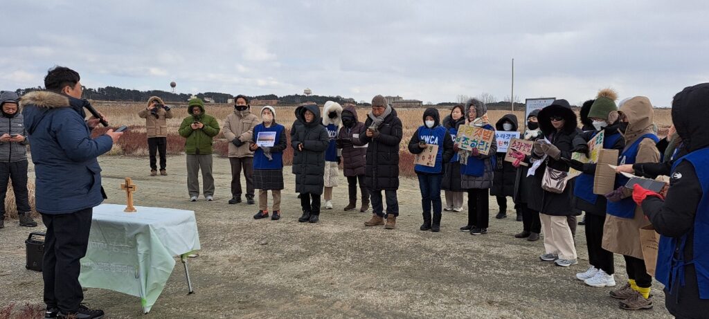 11월 30일(목) 오후 2시 군산공항 바로 옆 남수라갯벌에서 올해 마지막 기후위기기독교비상행동 주관의 기후정의 기도회가 열렸다. 세계 스카우트 잼버리 대회의 파행 사태와 영화 <수라>를 통해 잘 알려진 이곳에는 새만금 신공항 건설이 추진되고 있다. 그러나 새만금 신공항은 바로 옆 군산공항이 그렇듯, 중국을 견제하기 위한 미군의 군사시설로 전락하여 전북지역 경제는 커녕 지역안보를 위협할 것이 자명하다. 또한 저어새, 민물가마우지, 흰발농게 등 여전히 살아 숨 쉬는 멸종위기종의 터전인 갯벌에 대한 생태학살이라는 점에서, 기후위기에 역행하는 일이다. 새만금 신공항 건설을 전면 백지화하고, 수라갯벌을 다시 숨쉬게 하기 위해 고양, 군산, 남원, 익산, 전주YWCA 그리고 연합회 활동가 19명이 현장에 모였다.