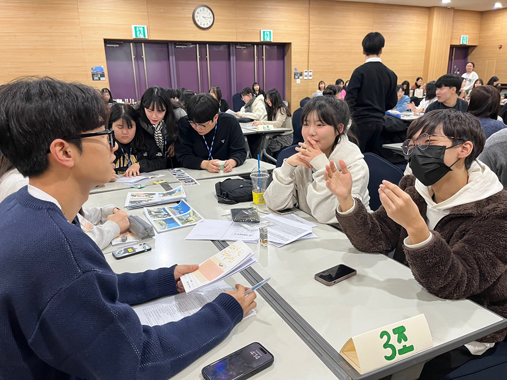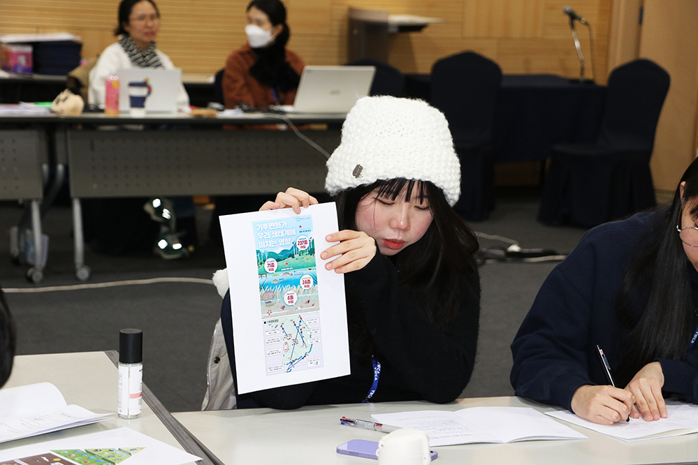 ▲Y-틴은 중심주제를 설정하기 위해 총 7개 조로 나뉘어 ‘기후와 환경’ 관련 뉴스 기사와 자료 등을 읽고 토론하는 시간을 가졌다.