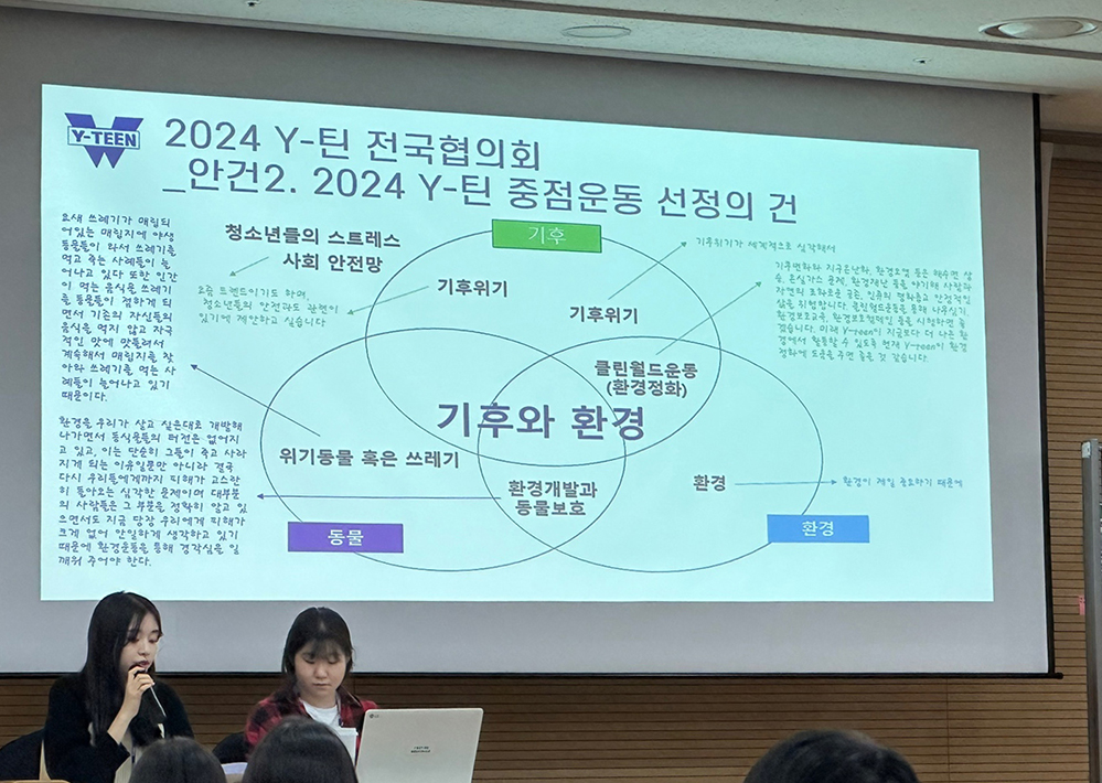 Y-틴은 전날에 토론과 협의를 통해 정리해본 운동 주제를 17일 Y-틴 전국협의회에서 공유했다. 환경과 동물, 기후와 환경, 다문화 인식 개선 등의 다양한 주제가 제시됐고, 기후와 생태계가 투표를 통해 2024년 중점운동 주제로 결정됐다. 운동 캐치프레이즈는 ‘녹색 생각, 지구를 위한 큰 힘’으로 정해졌다.