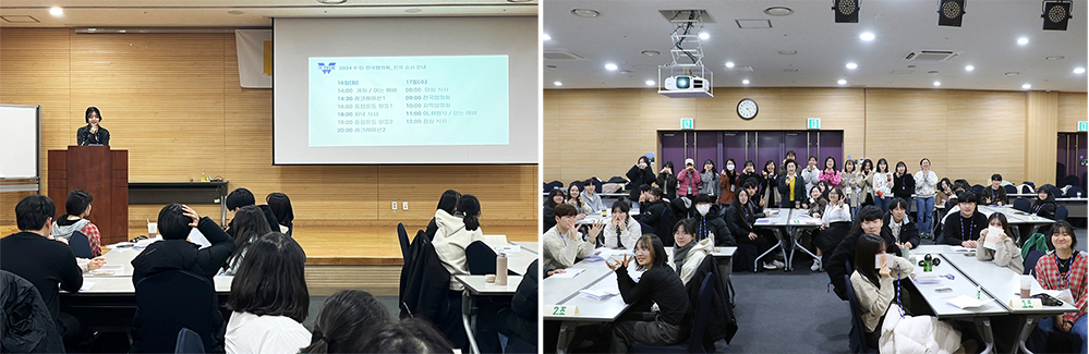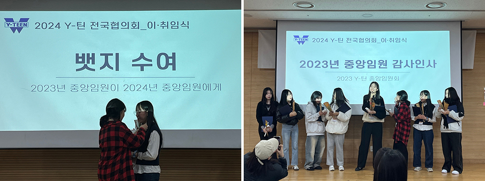 ▲(왼쪽 사진) 2024 Y-틴 전국협의회 이·취임식. (오른쪽 사진) 김민선 2023년 Y-틴 회장이 감사인사를 전하고 있다.