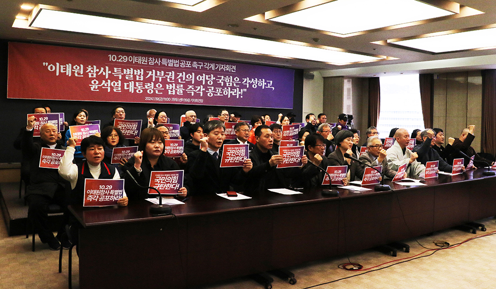 10.29 이태원 참사 유가족협의회와 시민대책회의는 19일(금) 오전 11시 프레스센터에서 ‘10.29 이태원 참사 특별법 공포 촉구 각계 기자회견’을 개최했다.