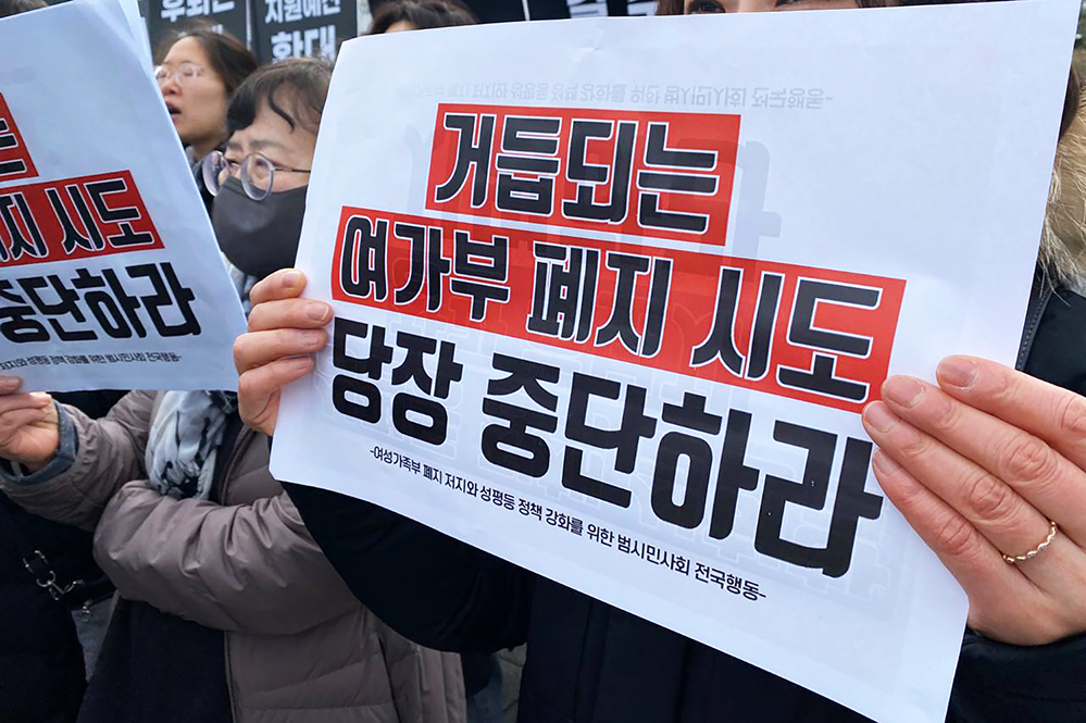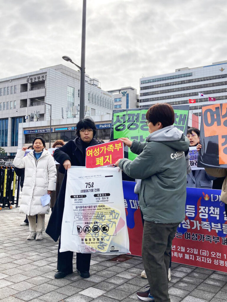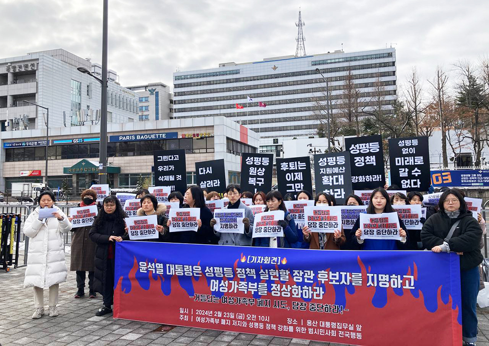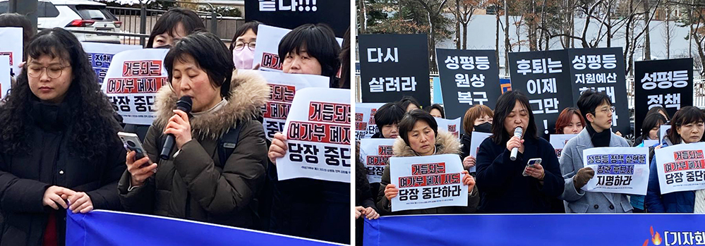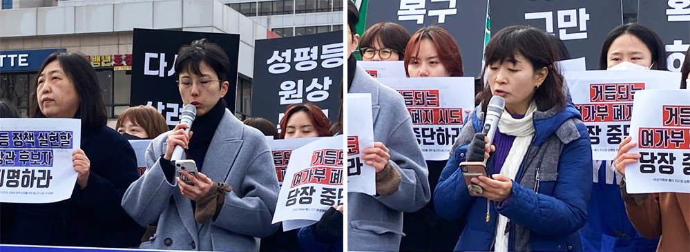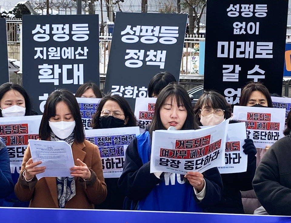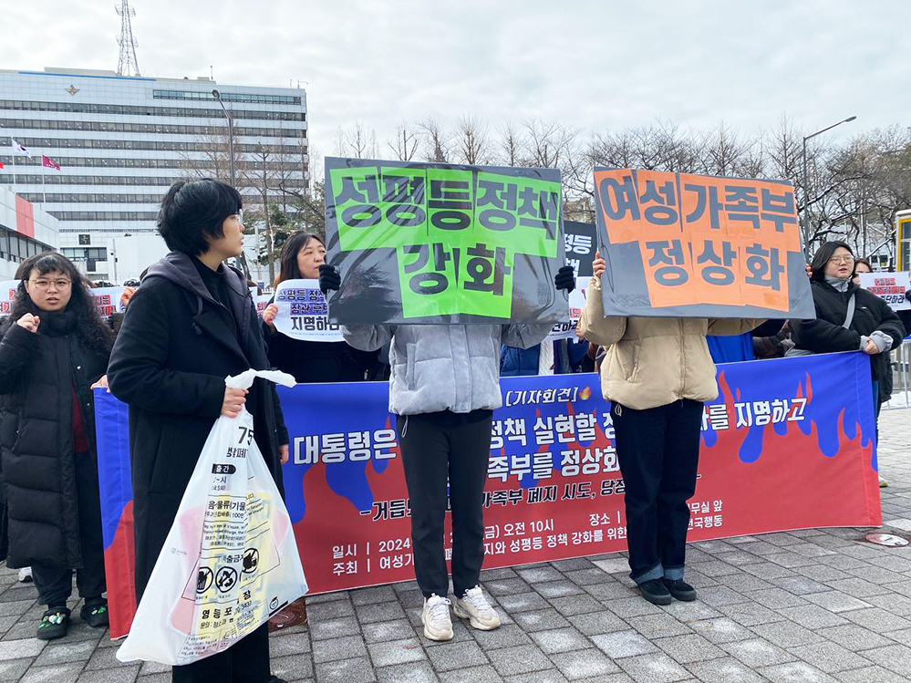 이에 전국 900여개 여성·시민·노동·인권·종교·환경단체 연대체인 여가부 폐지 저지 전국행동는 기자회견을 열어 윤석열 정부를 규탄하고 여성가족부 정상화를 촉구했다.