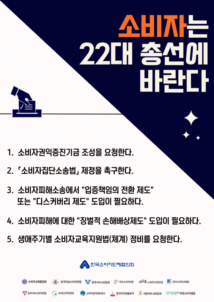 한국소비자단체협의회가 22대 국회의원 선거를 앞두고 22대 총선 5대 아젠다 ‘소비자는 22대 총선에 바란다’를 발표했다.