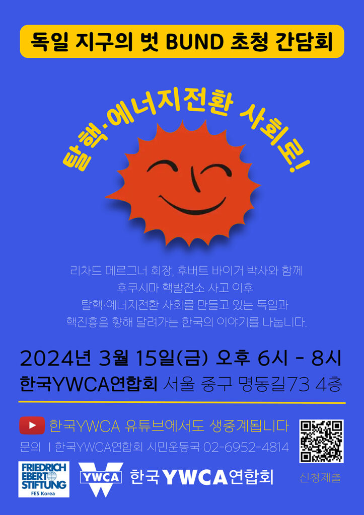 한국YWCA연합회는 프리드리히 에버트 재단과 함께 오는 3월 15일(금) 오후 6시 서울 중구 한국YWCA연합회에서 ‘독일 지구의 벗 BUND(분트) 초청 간담회 “탈핵·에너지 전환 사회로”를 개최한다. 이번 간담회는 후쿠시마 핵사고 13주년을 맞아 한국의 탈핵과 에너지전환을 모색하기 위해 마련됐다.