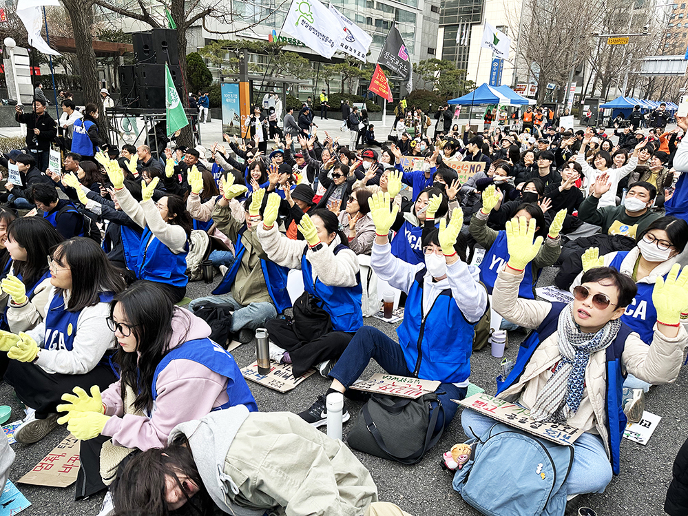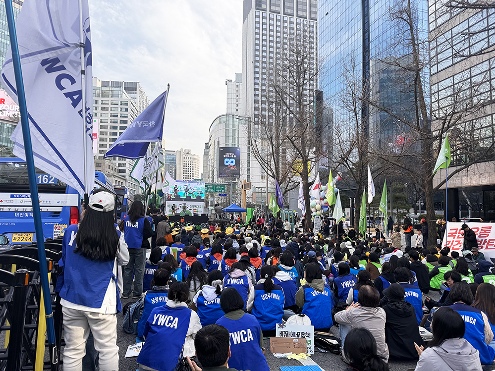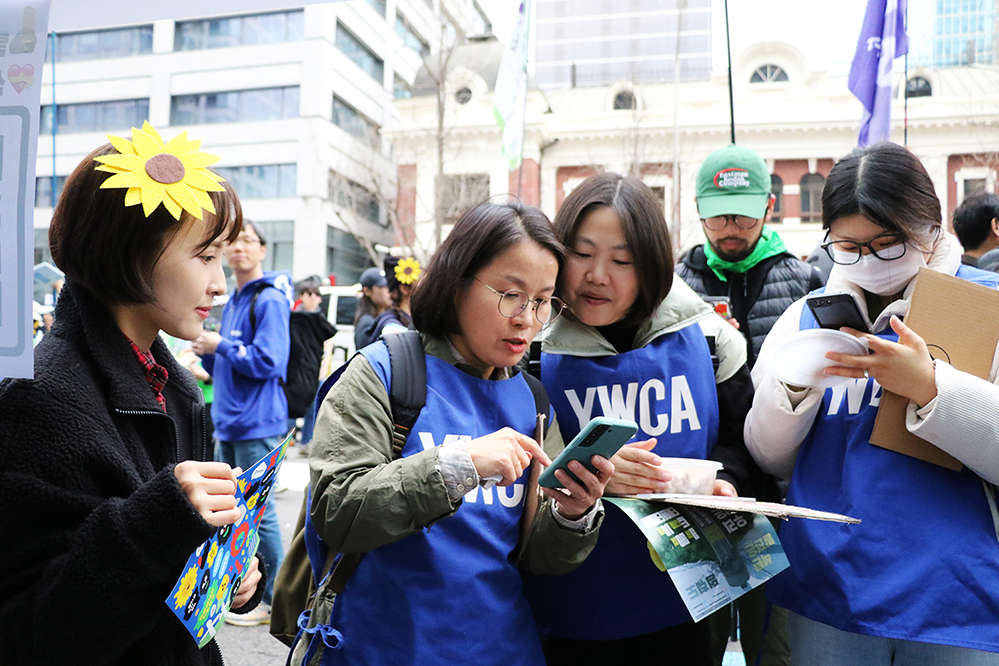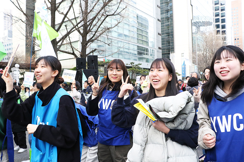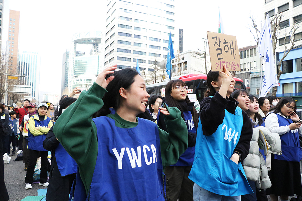 ▲집회는 즐겁게! 흥겹게 본행사에 참여 중인 한국YWCA 활동가들.