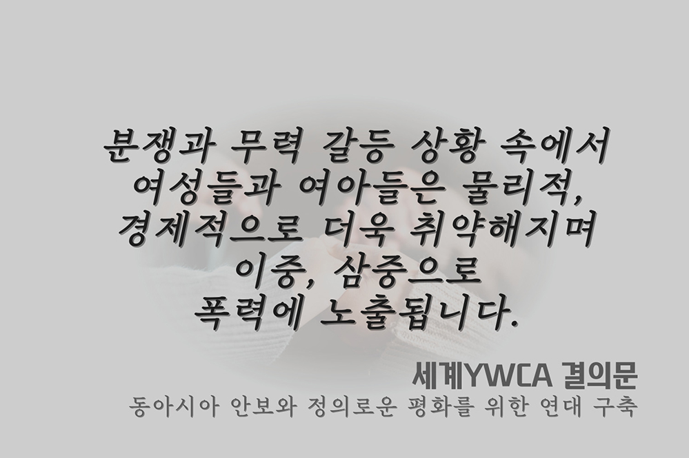 2023년 11월 말 진행된 제30차 세계YWCA대회에서 한국YWCA가 제안한 ‘동아시아의 안보와 정의로운 평화를 위한 연대 구축’ 결의문이 95%가 넘는 전폭적인 지지를 받아 통과되었습니다.
