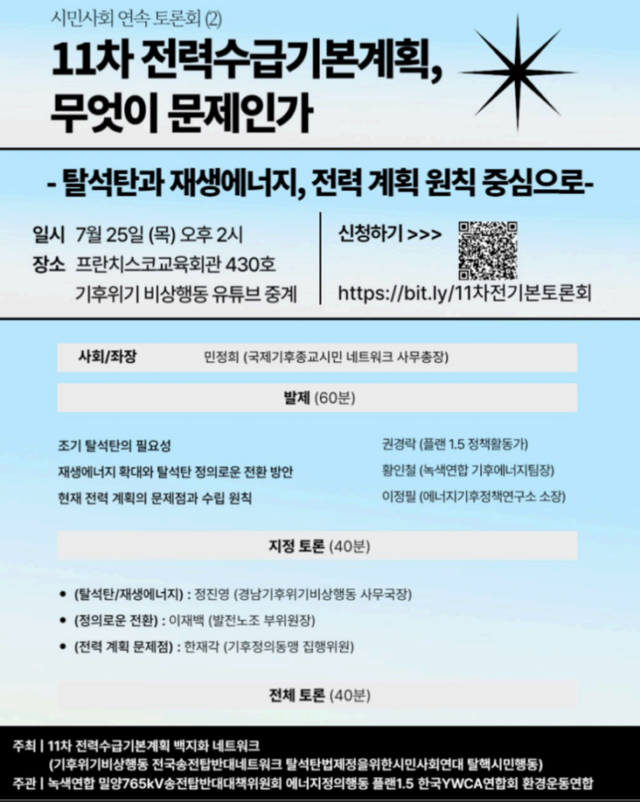 7월 25일(목) 오후 2시, 프란치스코교육회관 430호에서 ‘11차 전력수급기본계획, 무엇이 문제인가: 탈석탄과 재생에너지, 전력 계획 원칙 중심으로’ 토론회가 개최됐다. 한국YWCA연합회가 주관하고 11차 전력수급기본 계획 백지화 네트워크가 주최한 이번 토론회는 시민사회 연속 토론회 두 번째 시간으로, 탈석탄과 정의로운 전환에 대한 토론이 이뤄졌다.