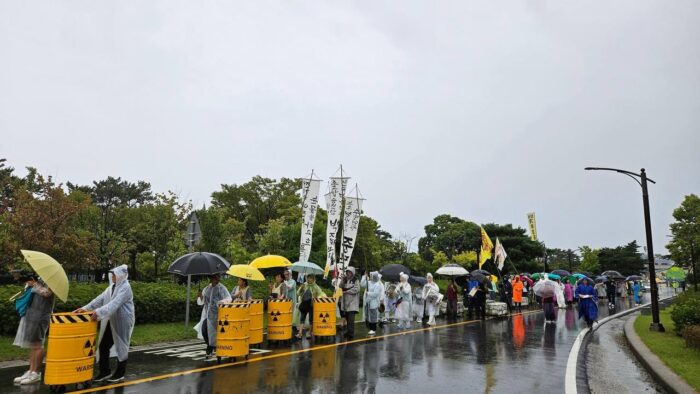 200여 명의 참가자들은 본 행사를 마치고 천막 농성장으로 자리를 옮겨 월성원전을 향해 우중 행진을 펼쳤다. 10년간 주민들이 걸었던 길을 전국의 연대자들이 함께 걷는 뜻깊은 행진이었다. 모형 핵 드럼통이 제일 앞에 서고, 만장, 관, 풍물패에 이어 참석자들이 깃발 및 현수막을 펼치고 기나긴 행진을 이어갔다.