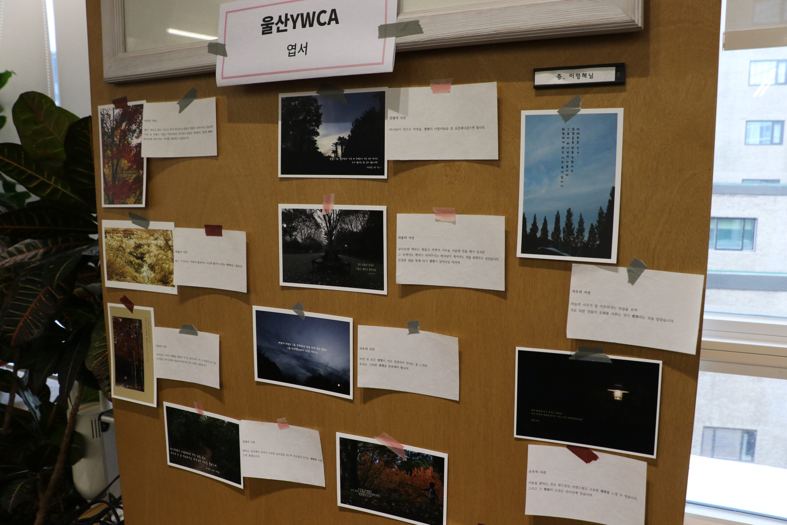 이날 행사에서는 각 지역에서 진행한 활동을 한눈에 볼 수 있도록 전시도 마련되었다. 울산Y 청소년들이 직접 촬영한 사진으로 제작한 엽서, 서울Y의 기후모의재판 대본, 창원Y의 기후보드게임이 전시되며 참가자들의 관심을 끌었다. 현장에 참여하지 못한 청주Y는 활동 보고 영상을 제작해 공유하며, 온라인을 통해 함께하는 연대의 의미를 더했다.