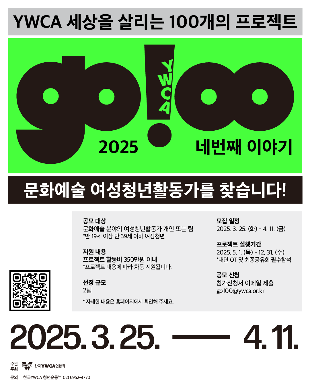 한국YWCA연합회가 2025년에도 ‘go100 YWCA 세상을 살리는 100개의 프로젝트’에 함께할 지역 여성청년활동가를 모집합니다.