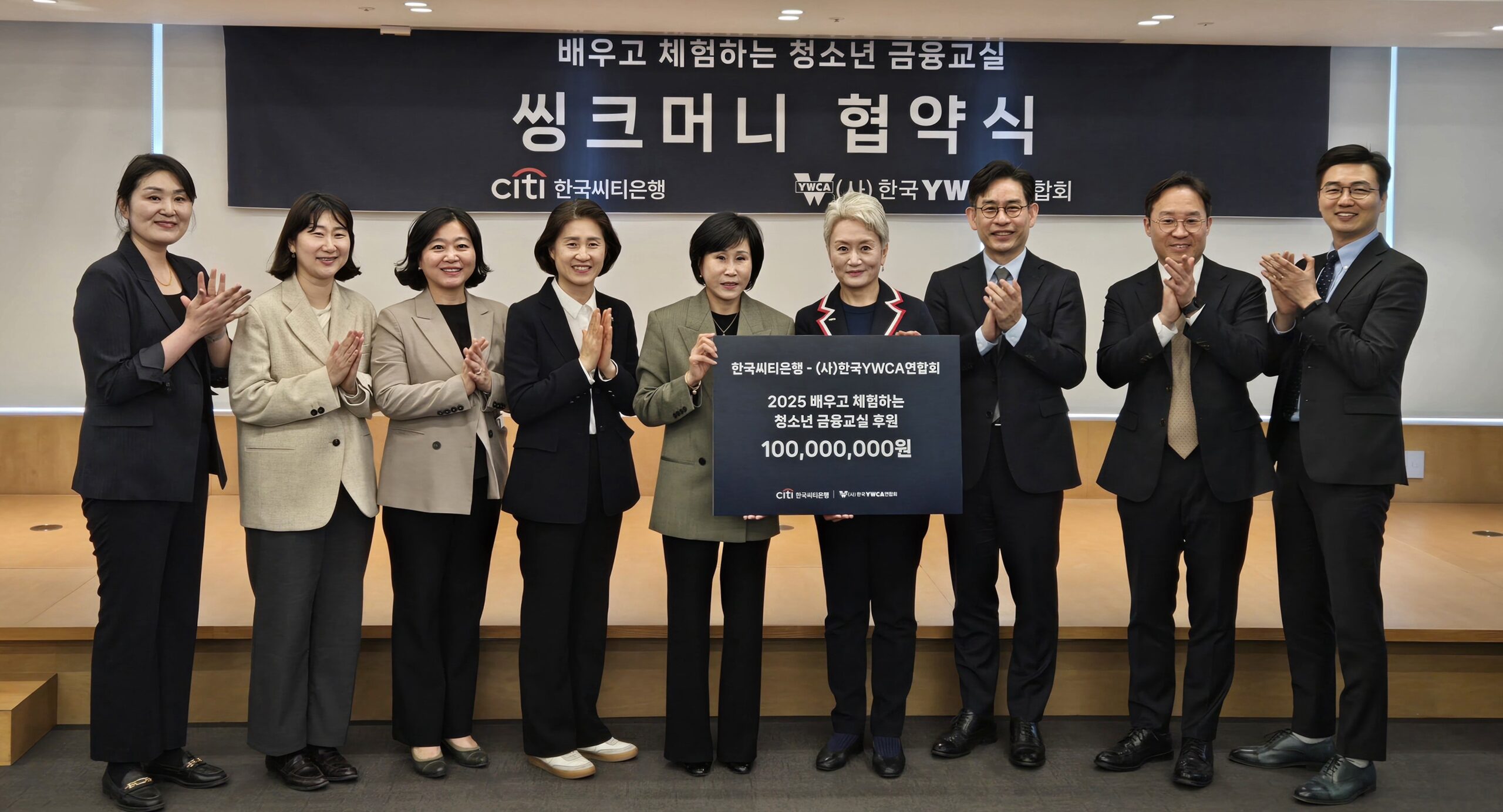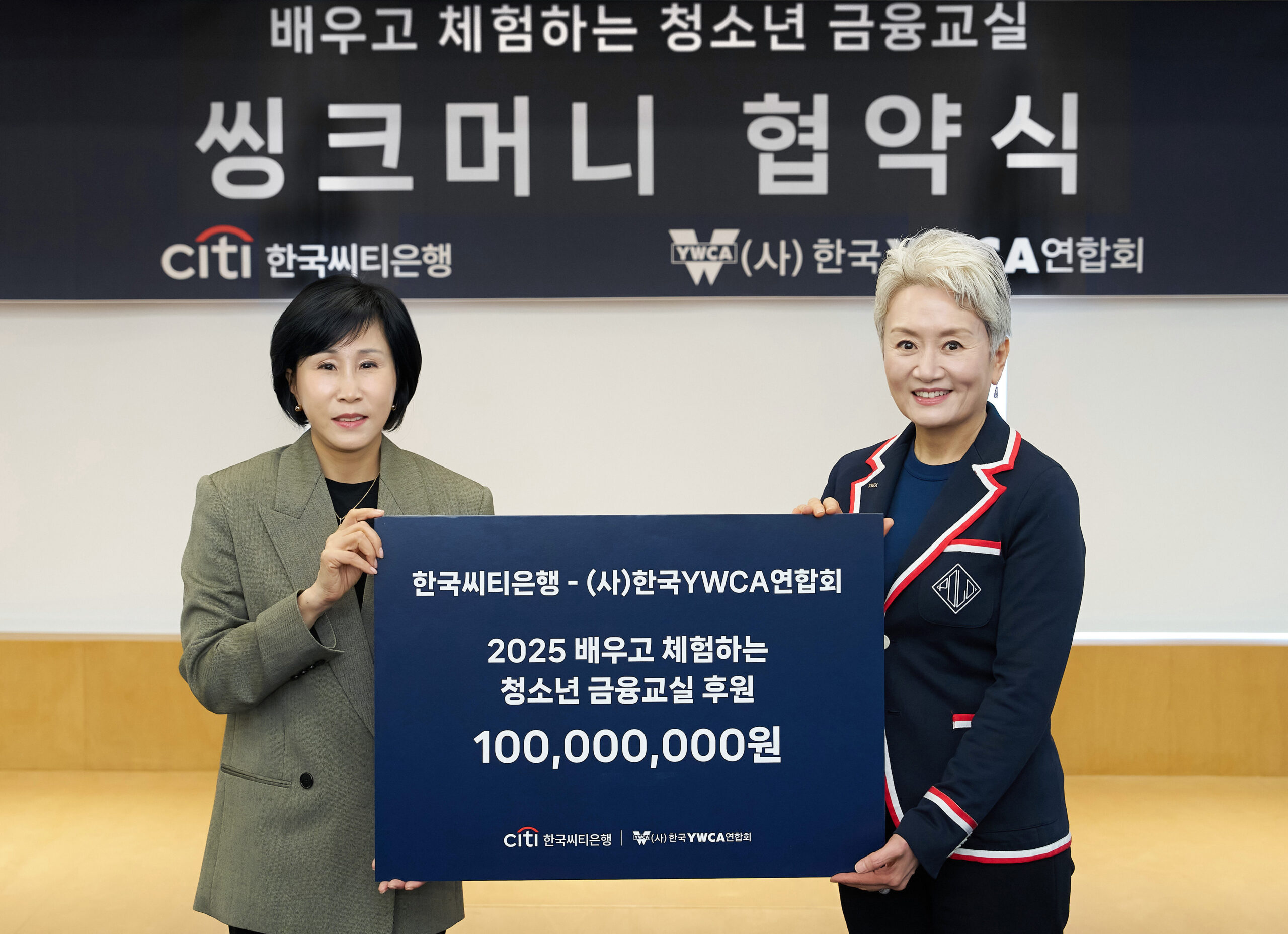 한국YWCA연합회(회장 조은영)는 한국씨티은행(은행장 유명순)과 ‘배우고 체험하는 청소년 금융교실 씽크머니’ 협약식을 3일 페이지명동 YWCA 회관에서 가졌다. 올해는 청소년 금융교육 씽크머니가 시작된 지 20주년이 되는 해로, 한국씨티은행은 YWCA에 1억 원을 전달하였다.