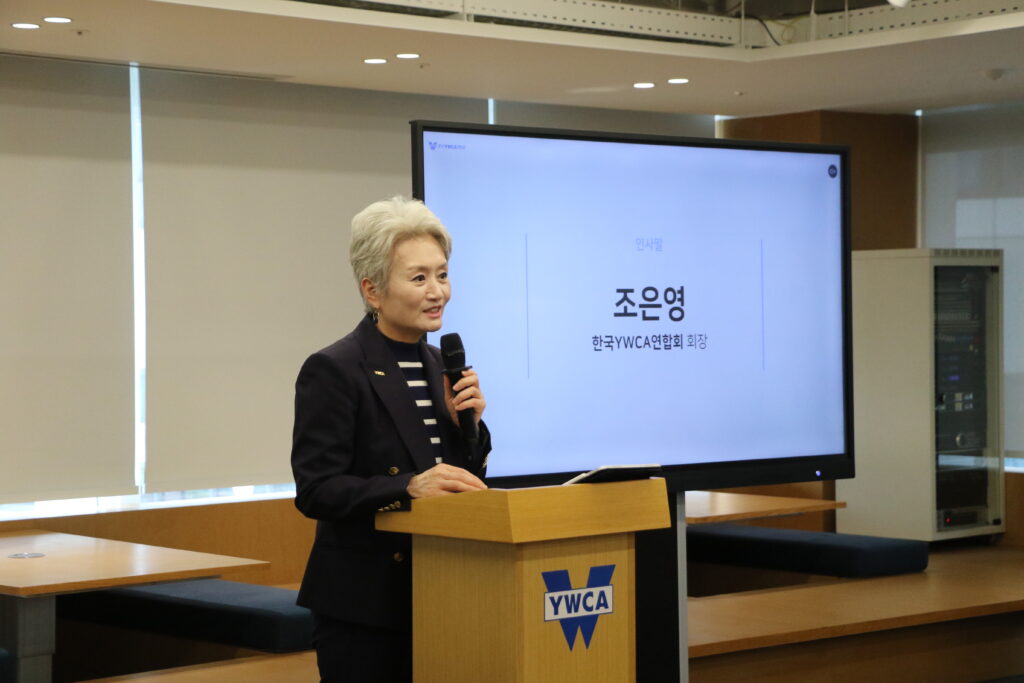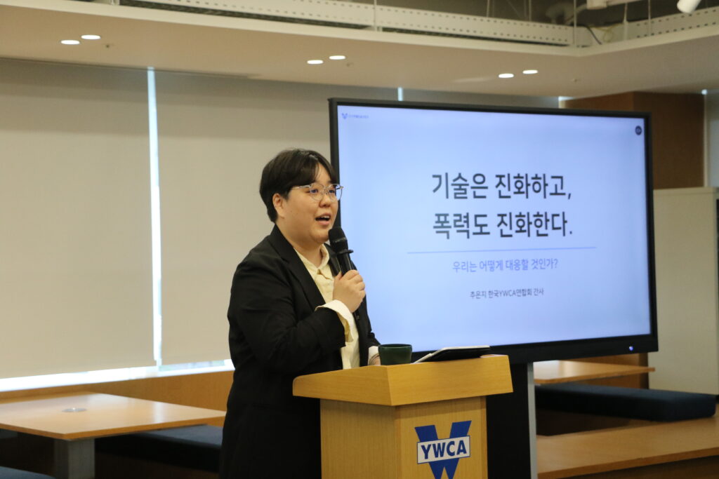 워크숍은 조은영 한국YWCA연합회 회장의 인사말로 시작되었다. 조 회장은 YWCA는 오랫동안 성차별과 성폭력에 맞서 지역 사회에서 활동해왔으며, 기술매개 젠더폭력이라는 새로운 문제에 대해서도 YWCA의 응답이 필요하다며 지난 3월 제 69차 UN여성지위위원회에서 한국YWCA가 주최한 병렬행사(Parallel Event)를 통해 한국 사회의 심각한 딥페이크 성폭력 문제를 국제사회에 알리며, TFGBV(Technology-Facilitated Gender-Based Violence)의 심각성을 공유한 바 있음을 공유했다.