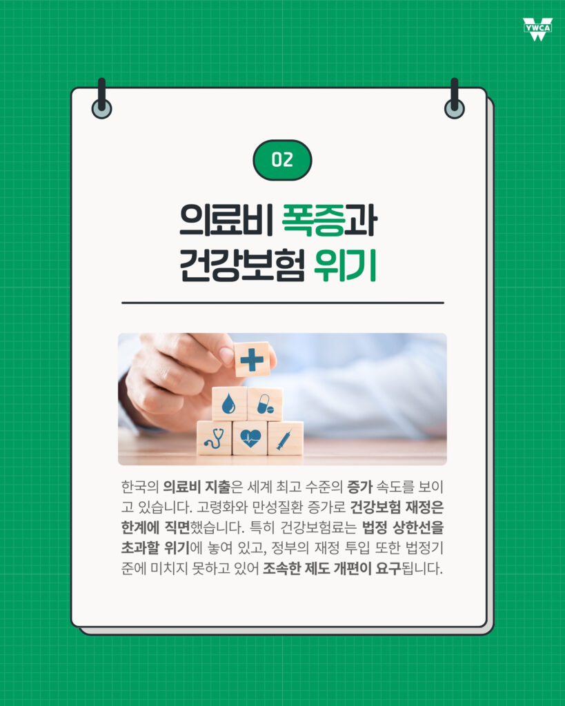 의료 혼란과 건강보험 재정 위기, 그리고 필수의료 인력 부족으로 인해 국민의 건강권이 심각하게 위협받고 있습니다. 정권마다 달라지는 의료정책과 공급자 중심의 제도는 지역·계층 간 의료격차를 심화시키고 있으며, 환자들은 여전히 과도한 의료비 부담과 의료 접근성 부족에 시달리고 있습니다. 지속가능한 건강보험, 필수의료 강화, 의료소비자 권리 보장을 위한 제도적 개혁이 절실합니다.