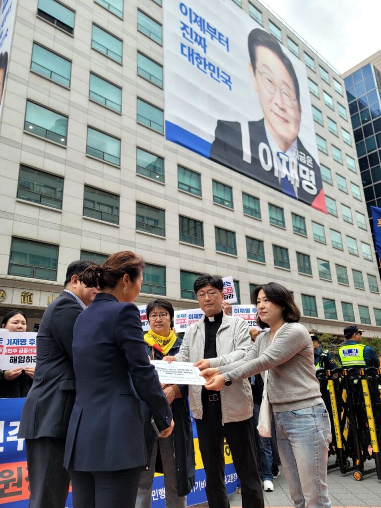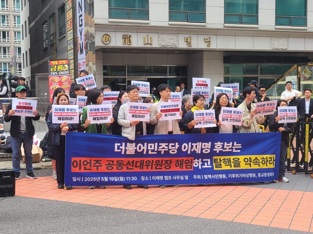 2025년 5월 19일(월) 오전 11시 30분, 국회대로 이재명 선거대책위원회 앞에서 탈핵시민행동, 기후위기비상행동, 종교환경회의가 공동으로 긴급 기자회견을 열고, 더불어민주당 이재명 후보에게 이언주 공동선대위원장의 해임과 탈핵 정책 약속을 촉구했습니다.