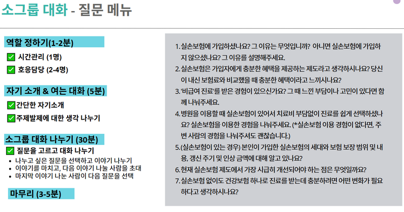 발제 후 참여자들은 네다섯 명씩 소그룹으로 나뉘어 각자의 경험과 의견을 나누었습니다. 소그룹에서는 7가지 준비된 질문을 바탕으로, 실손보험에 대한 참여자들의 생각을 들을 수 있었습니다. 제가 속한 그룹에서는 실손보험 없이 건강보험 하나로 충분하려면 어떤 변화가 필요할지, 실손보험 경험은 어땠는지, 실손보험 제도에서 개선되어야 할 점은 무엇인지 등을 이야기 나눴습니다.