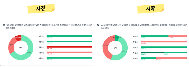 시민대화를 마무리하며, 대화 전후로 진행된 은하투표 결과에 대한 공유가 있었습니다. 참여자들의 의견 분포가 실제로 대화 이후 참여자들의 의견 분포가 확연히 달라진 점들을 확인할 수 있었습니다.