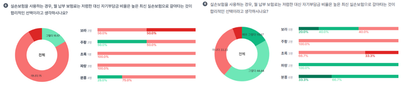 - – “실손보험을 사용하는 경우, 월 납부 보험료는 저렴한 대신 자기부담금 비율은 높은 최신 실손보험으로 갈아타는 것이 합리적인 선택이라고 생각하시나요?”라는 질문에는 “그렇다”가 늘어나는 결과를 볼 수 있었습니다.