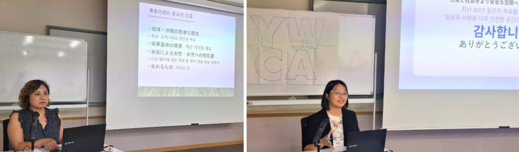 일본YWCA는 국가 보고에서 전쟁 책임을 둘러싼 역사 수정주의가 청년 세대 내 확산하며, 전쟁의 피해와 책임을 분리하고, 폭력의 재발을 막기 위한 사회적 질서가 약화하고 있다고 우려했다. 전쟁 책임을 묻는 것은 과거의 반성을 넘어 오늘날 다양한 사람들이 공존하기 위해 평화의 질서를 고민하는 과정이며, 이는 바로 ‘안전한 공간’을 만드는 일임을 강조했다. 또한 오키나와 주둔 미군의 여성 대상 성폭력 문제를 공유하며, 국가 간 권력 차이와 일본 내 지역 간 차별이 특히 여성들에게 구조적 폭력으로 작용하고 있음을 알렸다. 일본YWCA는 강간과 살해 위협으로부터 안전한 오키나와를 만들기 위해서는, 미군의 전면 철수와 오키나와 주민과 여성들의 동등한 권리와 안전 보장이 반드시 필요하다고 강조했다.