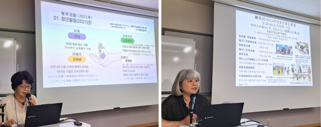 일본YWCA는 교토, 나고야, 후쿠오카 등 여러 지역 YWCA에서 운영 중인 여성 청년 자립지원 홈과 일본어가 모국어가 아닌 어린이를 위한 학습 교실, 여성들이 편안하게 머물 수 있는 카페와 키친 등을 사례로 소개했다. 이를 통해 젊은 여성들이 실패와 성공의 경험을 충분히 획득하고, “살아도 괜찮다”라는 감각을 회복하는 공간을 만들고자 하였다고 강조하였다.