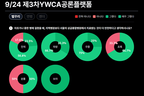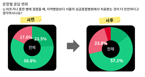 대화 전후 은하투표 결과에서도 참가자들의 인식 변화가 확인되었습니다. “아프거나 중한 병에 걸렸을 때, 지역병원보다 서울의 상급종합병원에서 치료받는 것이 더 안전하다고 생각하시나요?”는 질문에 대해 ‘아니다/매우 아니다’라고 응답한 비율은 17.6%에서 28.6%로 늘어났습니다. 또한 “지역의료는 획일적으로 설계되기보다 지역 맞춤형으로 구축되어야 한다”는 질문에는 ‘아니다’라고 대답했던 참여자도 응답을 바꿔, 참가자 전원이 “그렇다/ 매우 그렇다”라고 응답했습니다. 참가자들이 전문가의 설명을 듣고 서로 이야기를 나누면서, 이전과는 다른 시각을 접하고 자신의 생각을 확장할 수 있었음을 알 수 있습니다.