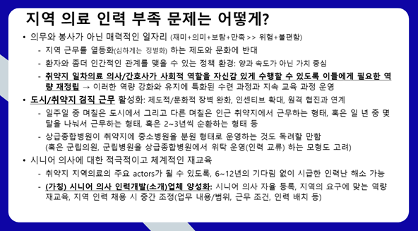 마지막으로 그는 지역 의료 인력 문제에 대해서도 제언했습니다. 의사와 간호사가 억지로 배치되는 방식은 효과적이지 않으며, 지역에서 일하는 것이 “재미있고 의미 있으며 보람 있는 경험”이 되도록 만들어야 한다고 말했습니다. 이를 위해 도시와 시골을 오가며 근무할 수 있는 겸직 형태, 은퇴한 시니어 의사들의 재교육과 재배치, 지역사회 의료인의 자긍심 강화가 필요하다고 덧붙였습니다. 그는 “지금의 각자도생식 의료 체계에서 벗어나, 소비자·공급자·정부가 함께 협력하는 네트워크형 의료 체계로 전환해야만 지역에서 안심할 수 있는 진료가 가능해진다”고 강의를 마무리했습니다.
