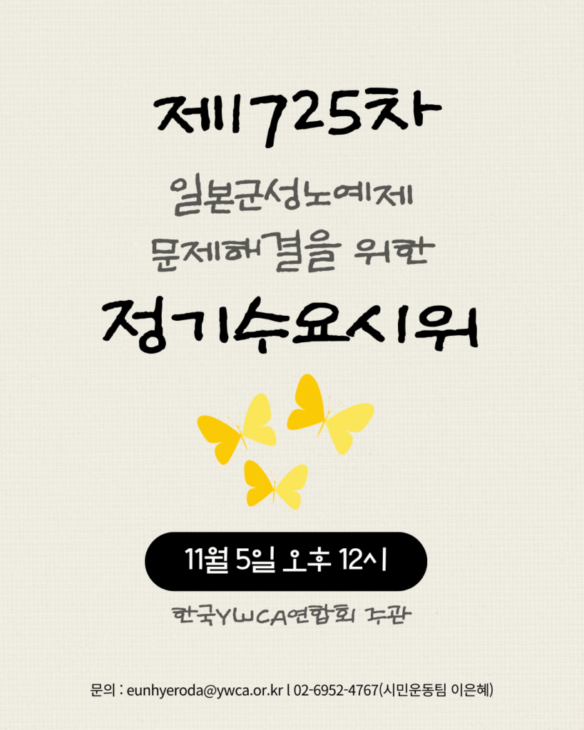 이번 수요시위는 일본군성노예제 문제의 진실을 되새기며, 전쟁과 폭력에 반대하는 시민사회의 연대를 이어가는 자리입니다. 특별히 전국의 Y-틴 청소년들은 ‘전국연대행동’을 통해 각 지역에서 평화의 소녀상을 지키는 조례 제·개정 활동을 이어가고 있습니다. 이번 시위에는 청소년이 사회와 발언으로 참여해, 청소년 세대의 실천과 연대가 현장에서 만나는 의미 있는 시간이 될 것입니다. 함께 평화를 말하고, 행동으로 이어가는 자리에 시민 여러분의 많은 참여를 부탁드립니다.