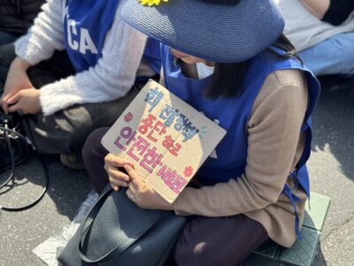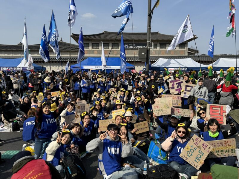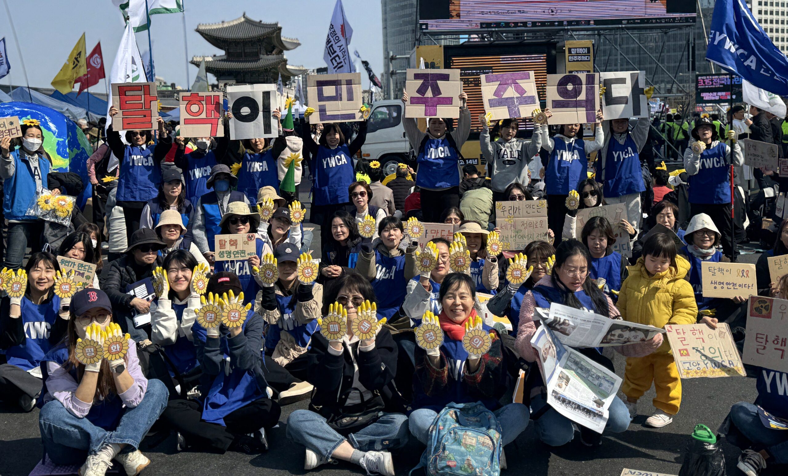‘후쿠시마 핵사고 14년, 탈핵-민주주의 행진’(이하 ‘315탈핵 집회’)이 3월 15일(토) 오후 2시, 경복궁 서쪽 서십자각터 앞 거리에서 진행됐다. 후쿠시마 핵사고 14년을 맞아 탈핵·기후환경·종교단체들은 윤석열 정부의 핵폭주 정책을 탄핵하고 에너지민주주의와 기후정의를 요구했다. 이날 집회에는 한국YWCA를 비롯해 약 500여 명이 함께했다. 이 가운데 전국에서 모인 회원YWCA(고양, 광양, 남양주, 목포, 부천, 수원, 안산, 안양과천군포의왕, 의정부)와 연합회 활동가 등 75여 명이 참여해 YWCA 파란 조끼를 입고, 노란 손장갑에 ‘탈핵, 생명, 정의, 평화, 탄핵’ 등의 피켓을 붙이며 탈핵의 염원을 담았다.