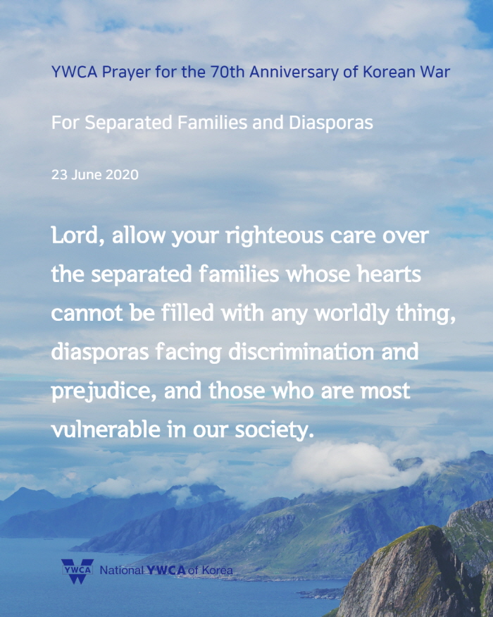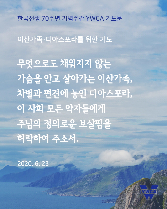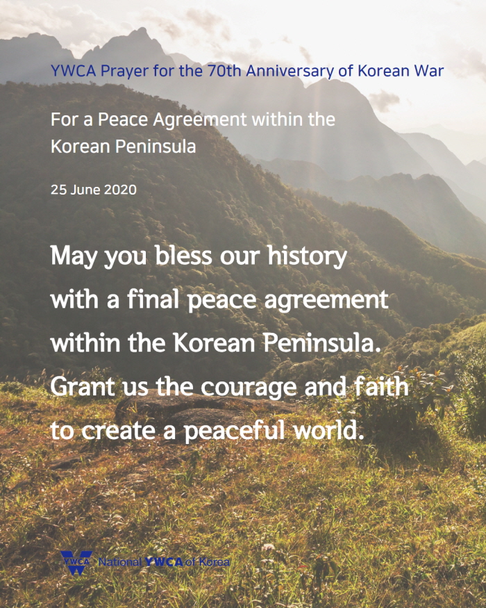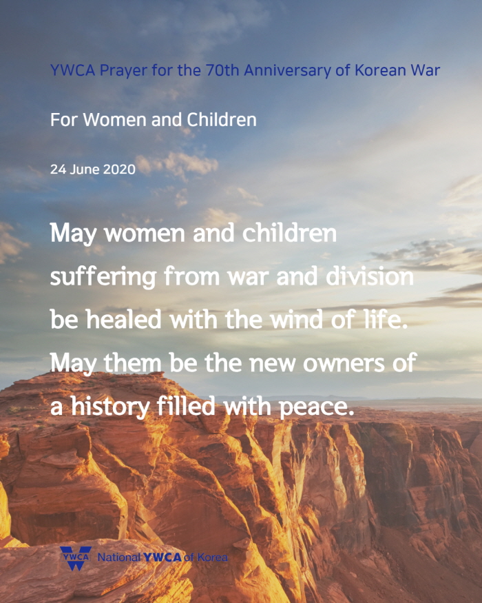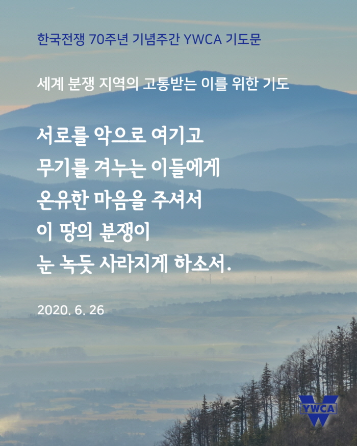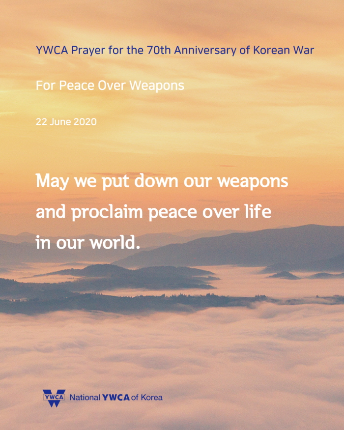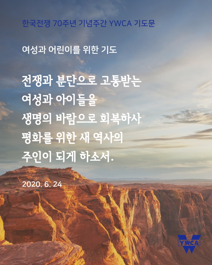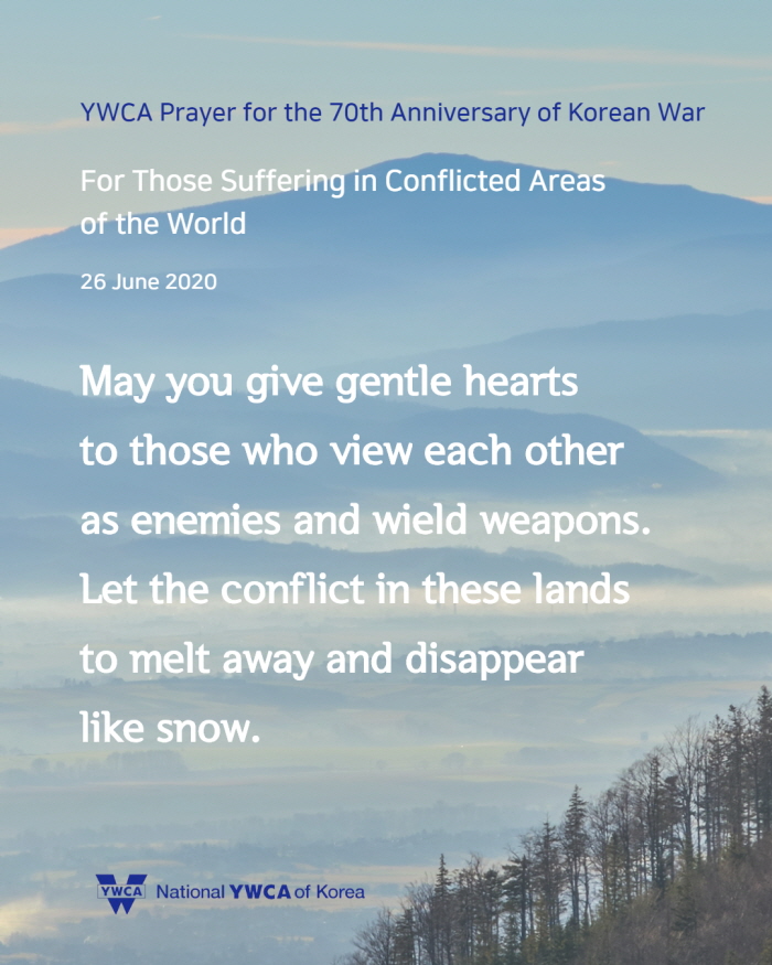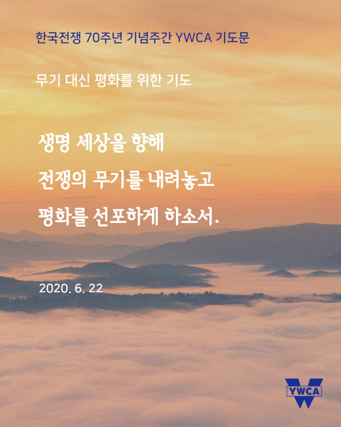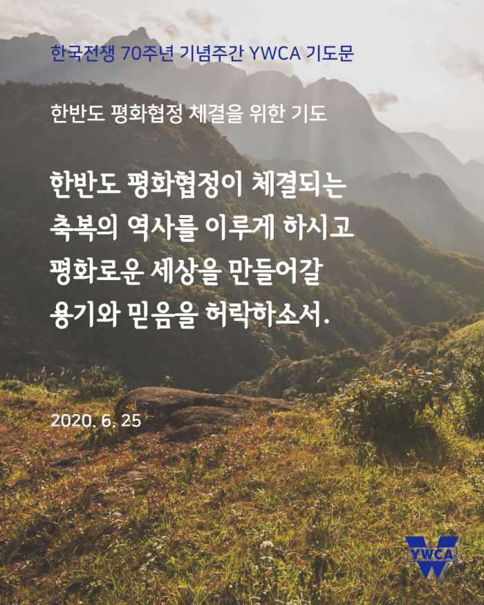 6월 25일(목)은 한국전쟁 발발 70주년이 되는 날입니다. 한국YWCA는 6월 22일(월)부터 26일(금)까지 ‘한국전쟁 70주년 기념 주간’으로 정하고, ‘한반도에서 전쟁이 종식되고 평화가 있기를, 분쟁과 갈등으로 갈라지고 상처 난 곳에 치유가 있기를’ 소망하며 기도로 함께 합니다. 한반도를 넘어 온 땅에 평화가 임하기를 함께 기도해주시기 바랍니다.