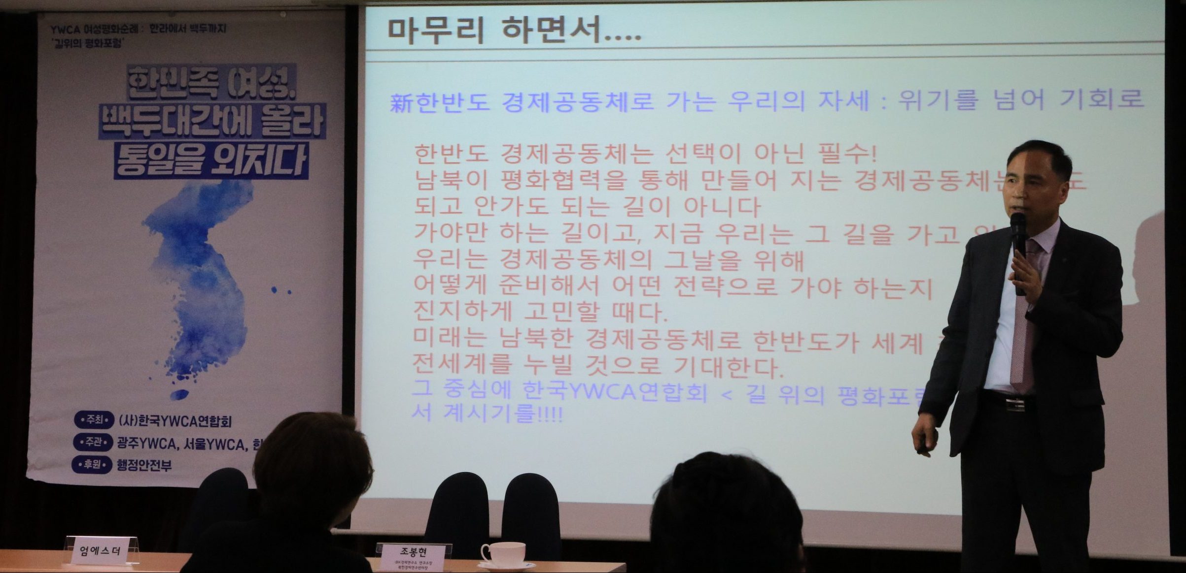 2019 ‘YWCA 여성평화순례: 한라에서 백두까지-태백편’을 준비하는 제5차 길위의평화포럼이 9월 19일(목) 연합회 강당에서 열렸다. 엄에스더 위원(평화통일위원회)이 진행을 맡고 조봉현 소장(IBK경제연구소, 북한경제연구센터)이 ‘신한반도 경제공동체와 시민사회 과제’를 주제로 강의했다.