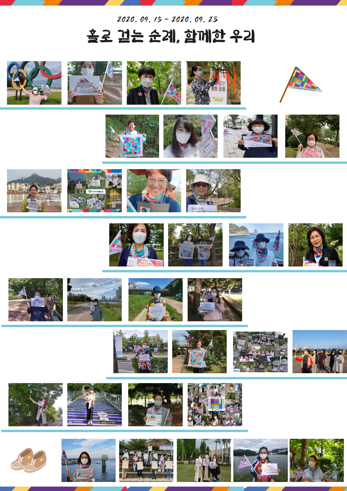 9월 15일부터 9월 23일까지 8일간에 걸쳐 진행된 2020 홀로 걷는 평화순례가 마무리되었습니다. ‘상처의 치유와 회복’이라는 주제로 총 39개의 회원 YWCA가 평화의 여정 가운데 함께해 주셨으며, 올해는 코로나 19라는 어려운 상황 속에서 각자의 삶의 자리를 지키며 순례를 이어갔습니다.