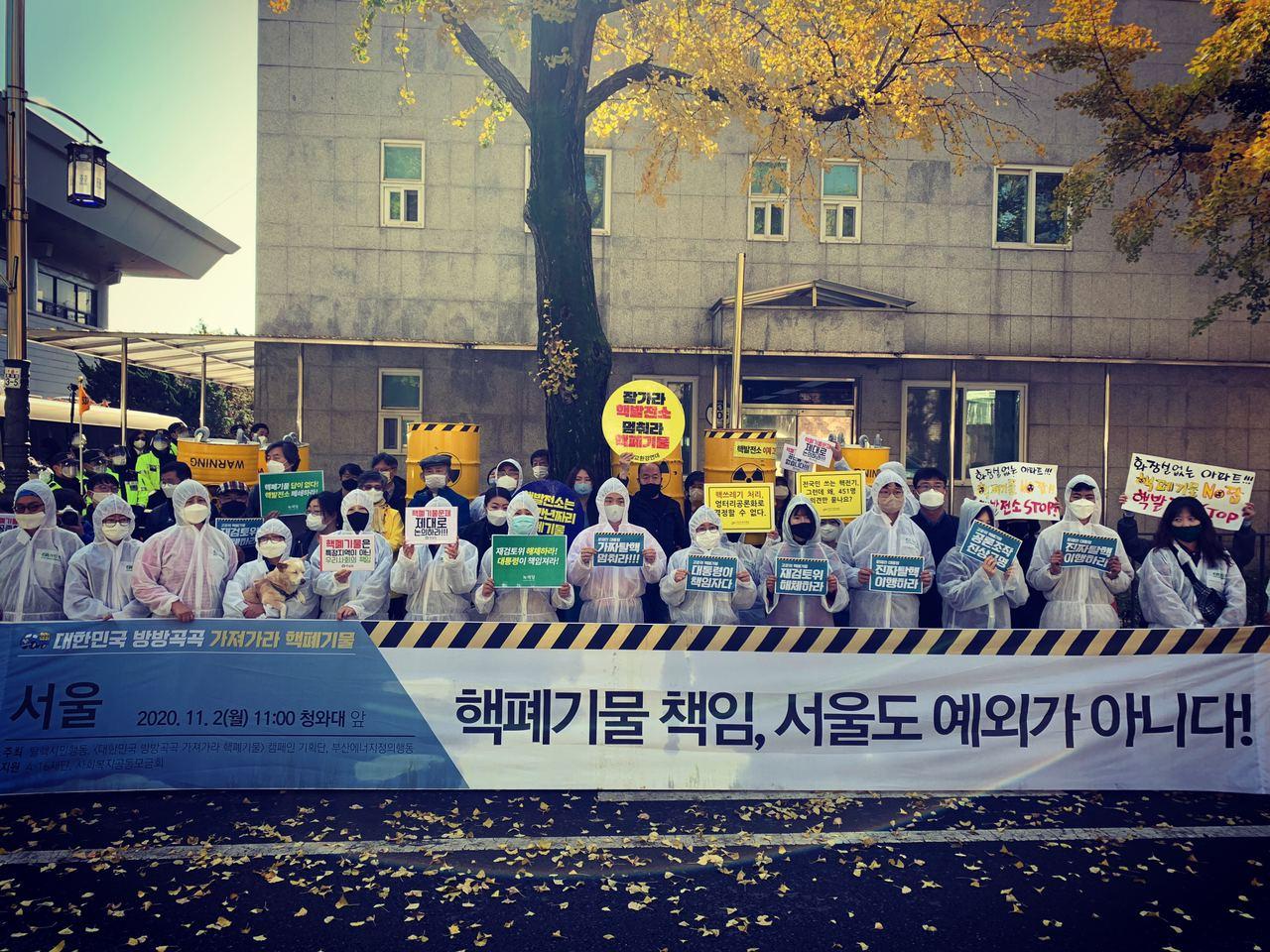 고준위핵폐기물의 위험과 책임에 대해 알리기 위해 20개의 핵폐기물 드럼통 모형으로 부산에서 출발한 <대한민국 방방곡곡 가져가라 핵폐기물> 캠페인을 진행해온 탈핵연대단체들이 울산, 경주, 울진, 대구, 영광, 대전 그리고 서울시내를 거쳐 11월 2일 청와대 앞에서 최종 마무리 기자회견을 진행하였습니다. 이 기자회견에서 YWCA가 연대하는 탈핵시민행동 등 탈핵연대단체들이 고준위핵폐기물 처리 문제점을 인정하고 제대로 된 해결을 하도록 촉구하였습니다.