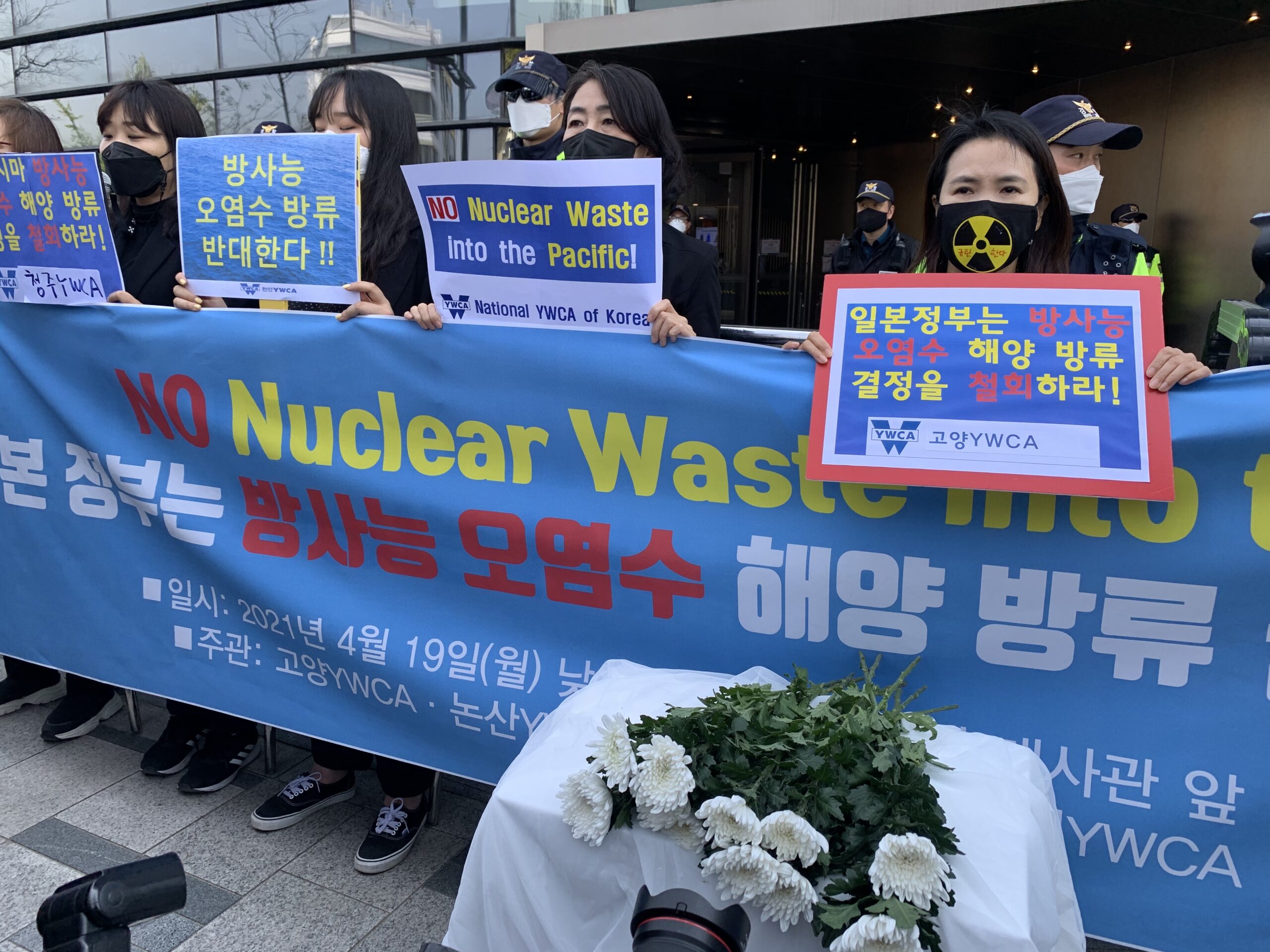 한국YWCA는 4월 19일 낮 12시 일본대사관 앞에서 후쿠시마 방사능 오염수 해양 방출 결정을 규탄하는 기자회견을 열었다. 지난 13일 일본 정부의 공식 결정에 대한 철회를 촉구하는 내용으로 인천YWCA·고양YWCA·천안YWCA·청주YWCA와 공동 주관으로 진행되었다. 탈핵생명기도와 기자회견 성명서에 이어, 방사능에 오염된 바다의 죽음을 추모하는 ‘바다장례식’을 통해 탈핵 생명 평화 세상을 향한 YWCA 회원들의 목소리를 전하였다.