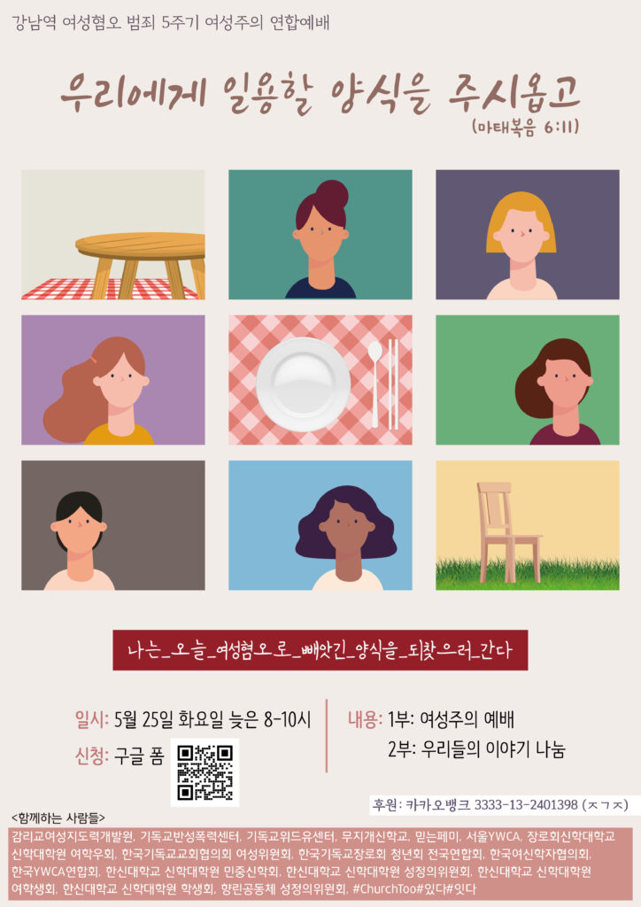 2017년부터 여러 단위가 연합하여 드려온 추모예배를 올해는 “우리에게 일용할 양식을 주시옵고”라는 주제로 함께 예배하고자 합니다. 예배를 통해 차별과 폭력, 여성혐오로 빼앗긴 우리의 양식을 되찾고, 이를 통해 치유와 회복을 누릴 수 있는 시간이 되기를 바랍니다. 예배 참여를 원하시는 분들은 아래 신청서를 작성하여 제출해주세요. 신청하신 분들께