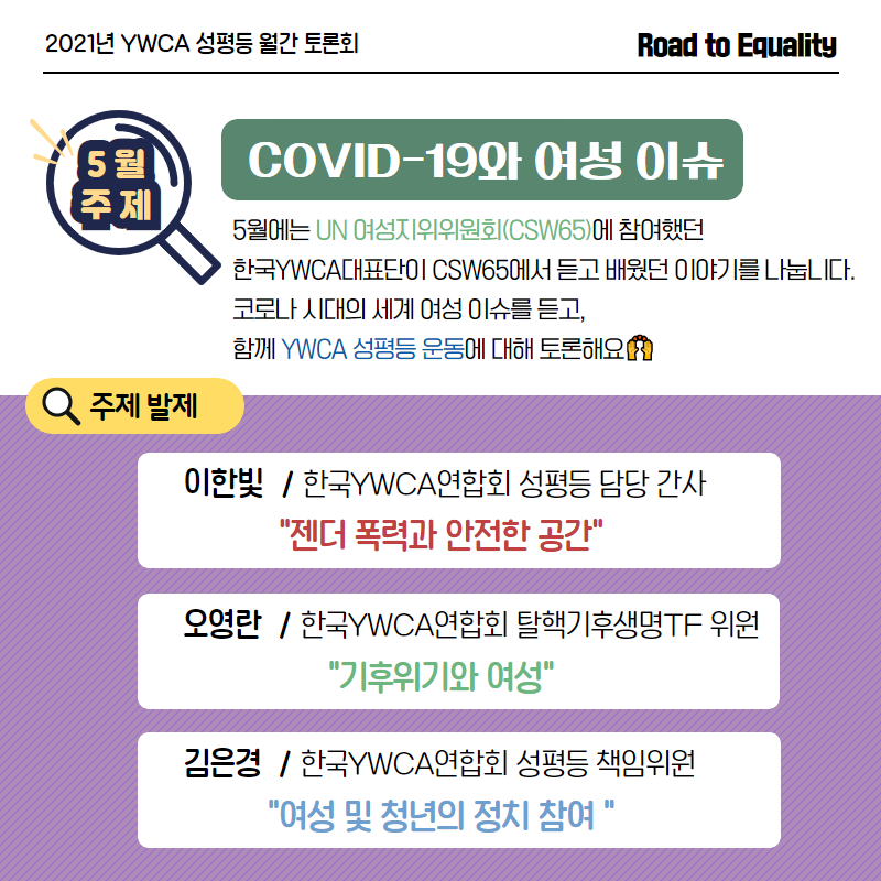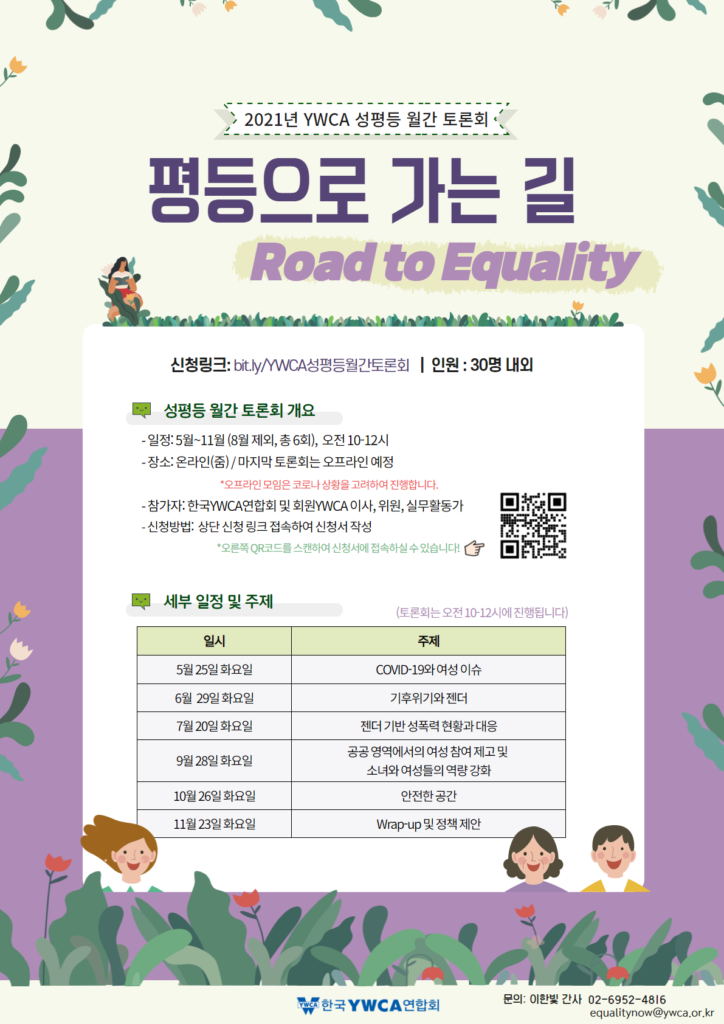 2021년 5월부터 11월까지 YWCA 성평등 월간 토론회, “평등으로 가는 길(Road to Equality)”을 운영합니다?