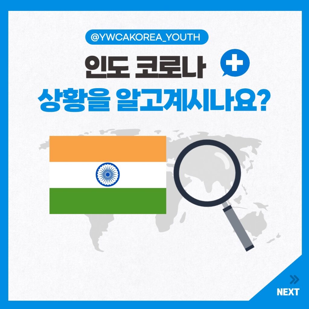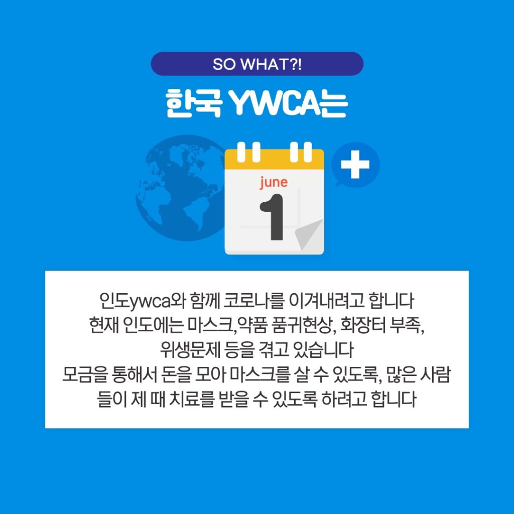 대학‧청년YWCA는 인도YWCA 지원을 위한 모금을 시작했다. 인도의 하루 코로나 사망자 숫자가 3,921명(6월 13일 기준)에 달한 지금, 인도YWCA는 코로나 극복을 위하여 경증 환자를 수용할 수 있는 공간을 운영하고 있다. 이에 대학‧청년YWCA 회원들이 인도YWCA 지원을 위한 모금을 기획했다. 인도 지원 모금을 보다 쉽게 접할 수 있는 ‘1922원 릴레이 모금 캠페인’과 일반 모금을 함께 진행하며, 모금 캠페인은 1922원 모금에 동참한 사람이 다음 순서로 모금할 사람을 지목하는 릴레이 캠페인 방식으로 진행되고 있다.
