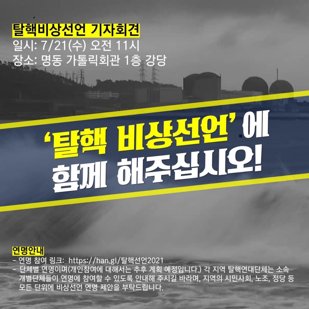 “지금 우리는 그 어느 때보다 강하게 말해야 합니다. 기후위기라는 위험을 핵에너지라는 또 다른 위험으로 해결해서는 안 된다고 말입니다. 탈핵으로 가는 길을 탄탄히 하고 정의로운 전환을 이루어야 한다고 말입니다. 기후위기를 기회 삼아 핵산업을 부활시키려는 꼼수를 지금 당장 멈추라고 말입니다. 지금 당장 행동하지 않으면 탈핵으로 나아갈 수 없기에 탈핵비상선언을 제안 드립니다.”