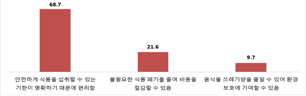 응답자들은 소비기한(412명, 59.6%)표시가 현행 제도인 유통기한(279명, 40.4%)보다 식품의 기한 표시로서 더 적절한 방법이라고 답하였다. 소비기한이 유통기한보다 “안전하게 식품을 섭취할 수 있는 기한이 명확하기 때문에 편리하다”(68.7%)라고 주된 이유를 꼽았으며, 다음으로 “불필요한 식품 폐기를 줄여 비용을 절감할 수 있다”(21.6%), 마지막으로 “음식물 쓰레기양을 줄일 수 있어 환경 보호에 기여할 수 있다”(9.7%)라고 답했다.