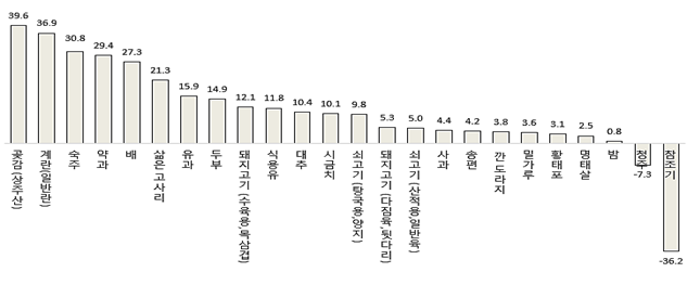 – 과일(22.6%) > 기타 식품(11.6%) > 축산물(9.8%) > 채소/임산물(9.7%) > 가공식품(5.0%) > 수산물(-11.8%) 순