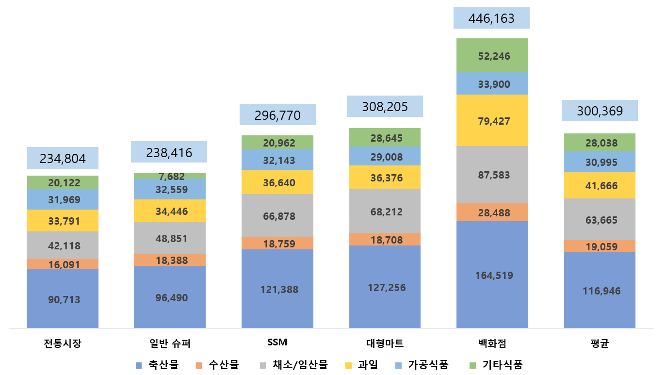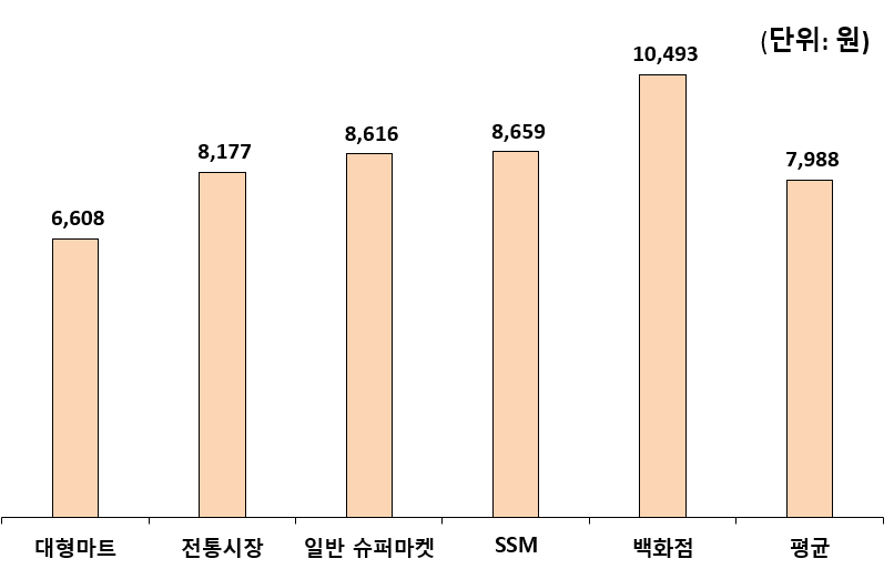– 전통시장(234,804원) < 일반 슈퍼마켓 < SSM < 대형마트 < 백화점(446,163원) 순