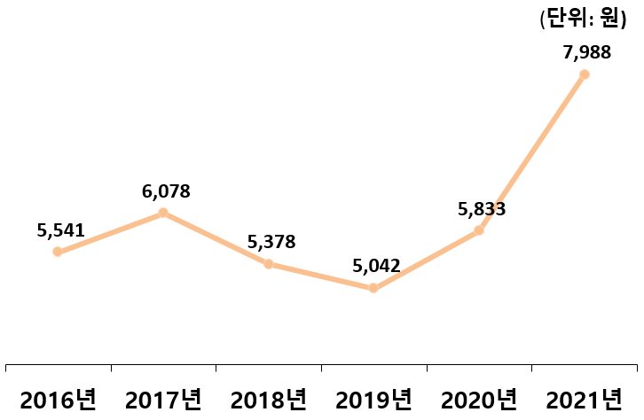 지난해 AI 발생 이후 최고 9,000원대까지 치솟았던 계란 가격은 점차 하락하여 추석 3주 전 서울시 88개 유통업체 가격조사결과 평균 7,988원으로 나타났다. 다만 지난 5년 내 추석 3주 전 계란 가격과 비교해 보면 전년도 평균 5,833원에 비해 2,155원(36.9%) 인상되었고, 계란 가격이 가장 낮았던 2019년 평균 5,042원과 비교했을 때는 2,946원(58.4%) 더 높아 평년에 비해 여전히 높은 것으로 조사되었다.