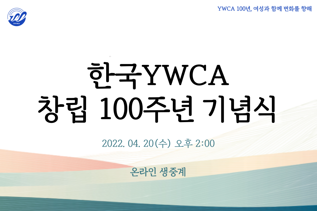 2022년 4월 20일, 한국YWCA 창립 100주년 기념식이 온라인으로 진행됩니다. 이번 기념식에는 실시간 수어 통역이 제공될 예정입니다. 기념식에 참여하여 YWCA 100년의 역사와 기쁨을 함께 나누기 바랍니다.