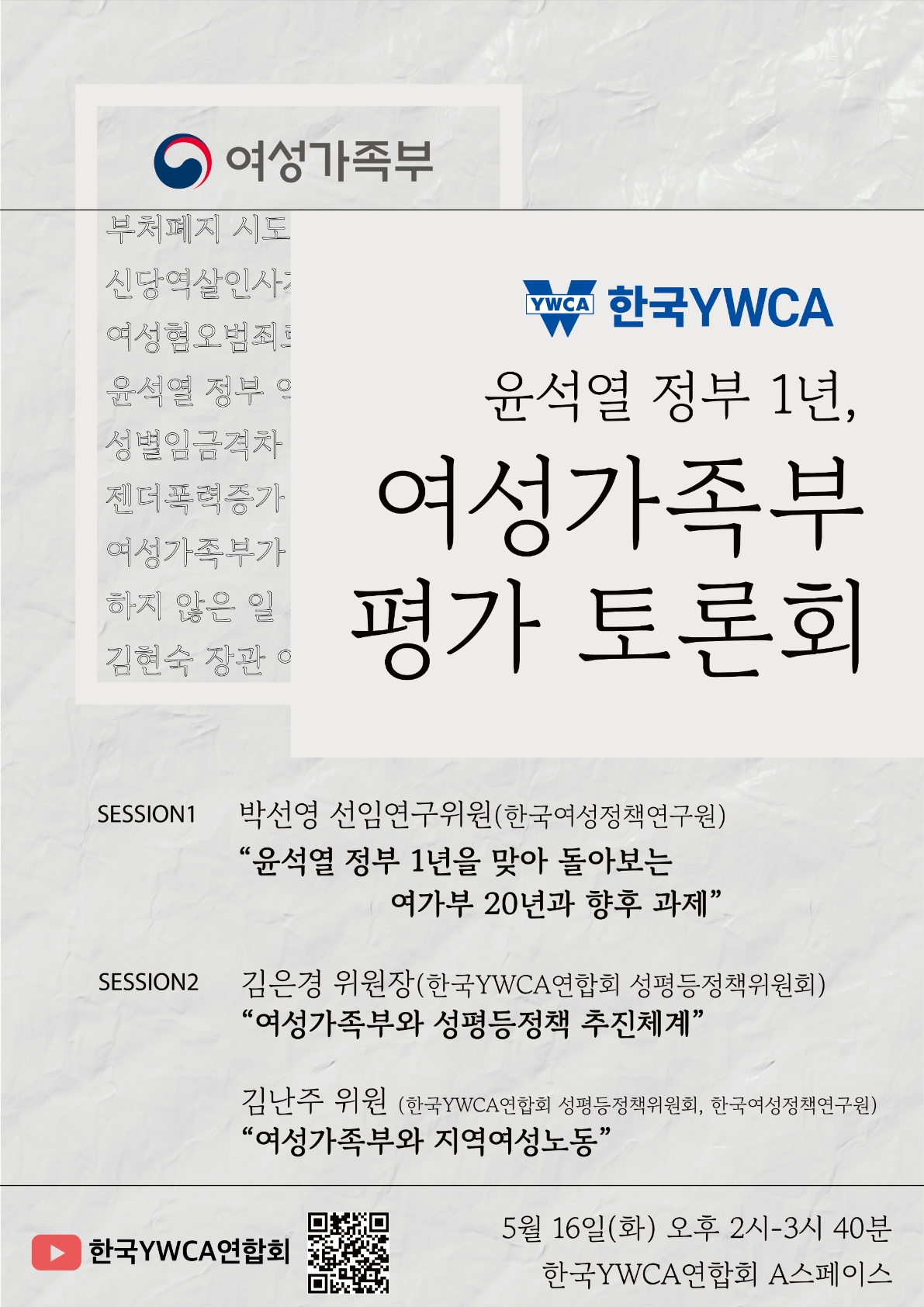 이에 한국YWCA연합회는 지난 1년 간 여성가족부의 역할을 되짚어 보고 향후 나아가야 할 방향을 모색하기 위해 평가 토론회를 진행하고자 합니다.