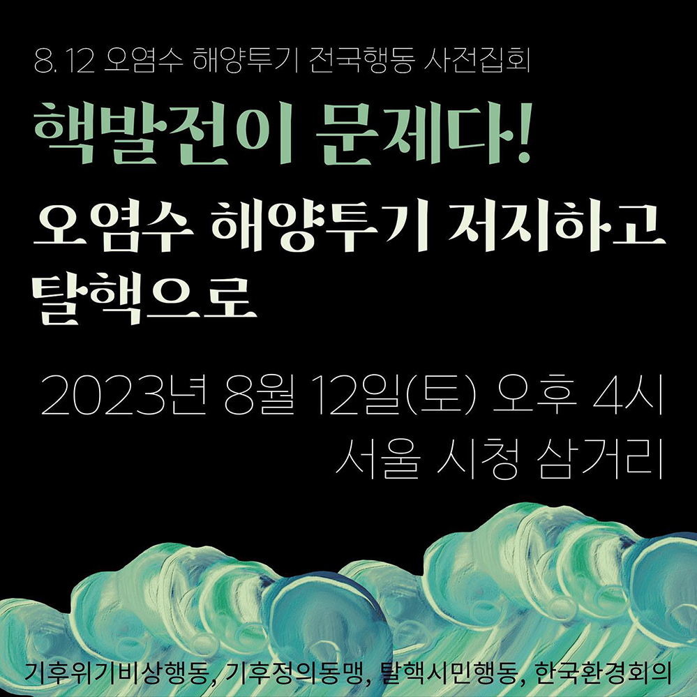 이에 기후위기비상행동과 기후정의동맹, 탈핵시민행동, 한국환경회의는 오는 8월 12일(토) 오후 4시 서울 시청 삼거리에서 8.12 오염수 해양투기 전국행동 사전집회 “핵발전이 문제다! 오염수 해양투기 저지하고 탈핵으로”를 개최합니다.