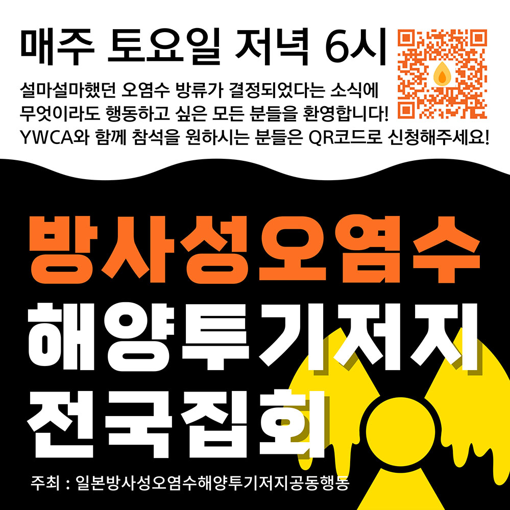 ‘일본 방사성오염수 해양투기 저지 공동행동 전국집회’가 8월 26일(토)과 9월 2일(토) 서울 프레스센터 앞에서 열립니다. 한국YWCA는 일본 방사성 오염수 해양투기 반대의 목소리를 내고자 하는 시민 여러분과 집회에 함께하고자 합니다.