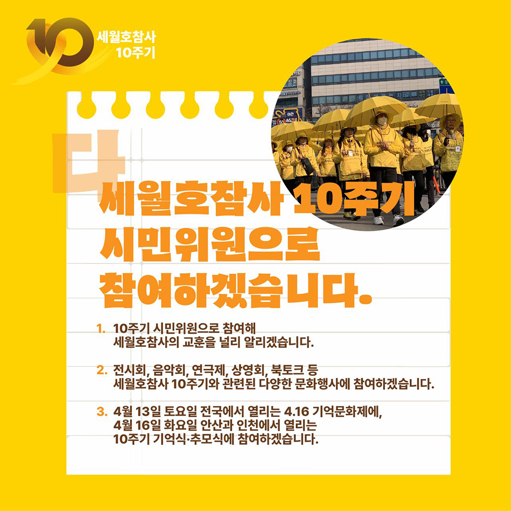 ?‍?‍? 다. 10주기 시민위원으로 참여하고 10주기 관련 다양한 문화행사와 기억식/추모식에 참여하겠습니다.