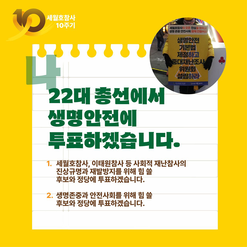10주기위원회는 “22대 국회를 생명안전 국회로” 만들자는 캠페인을 진행합니다. 생명안전을 위해 일할 정당과 후보에 투표하자는 캠페인에 참여할 것을 주위 분들에게 독려해주시기 바랍니다. 생명안전 투표 캠페인은 총선일인 4월 10일까지 진행합니다.