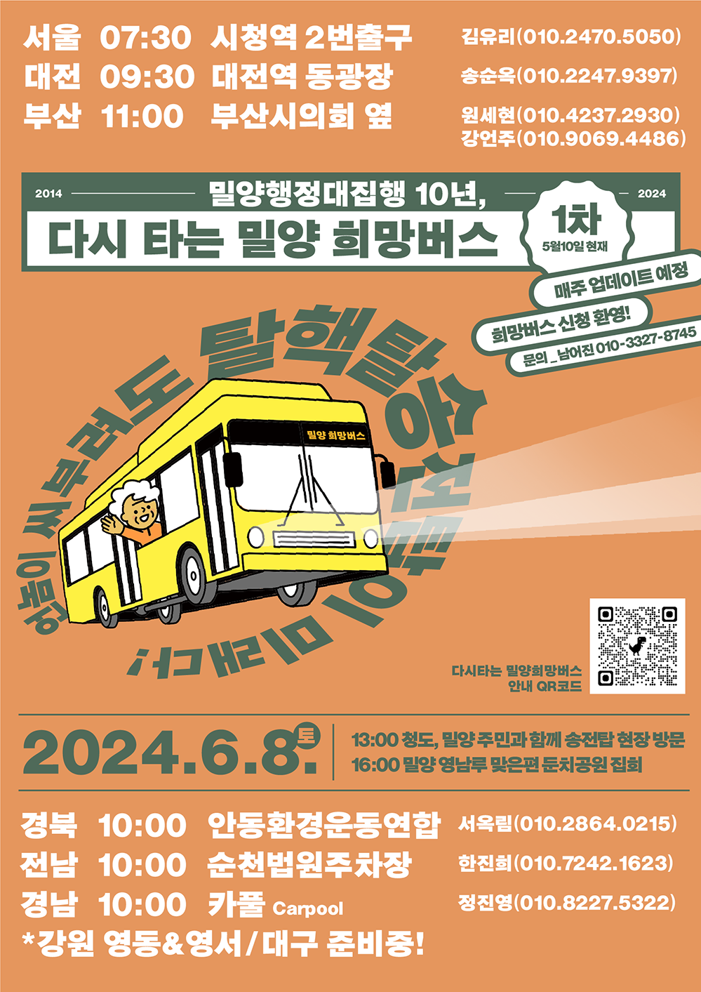 6월 8일 토요일에 열리는 밀양 송전탑 6.11 행정대집행 10주년 “윤석열 핵폭주 원천봉쇄 결의대회” 참가를 위해 다시 타는 밀양 희망 버스를 운영합니다. 각 버스는 청도 삼평리, 밀양 평밭마을, 고정마을에 방문하여 주민들과 함께 사전 행사를 진행한 후, 밀양 영남루 맞은편인 둔치공원에서 함께 모여 결의대회에 참여할 예정입니다. 이 버스는 각 지역에서 밀양으로 출발하여, 다시 각 지역으로 돌아가는 왕복버스입니다. 자세한 안내는 지역별 신청링크에서 확인해주세요!