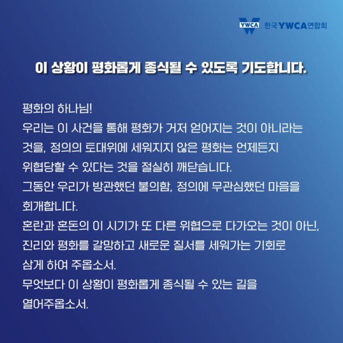 한국 사회의 정의로운 회복과 이 상황이 평화롭게 해결될 수 있도록 매일 아침 자신의 처소에서 기도해주시기 바랍니다.