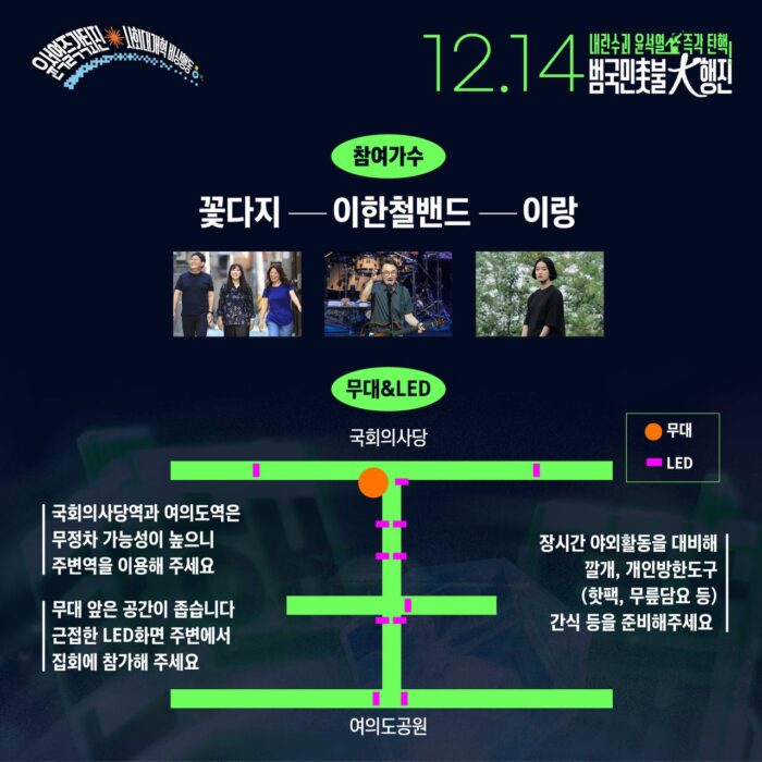 ? 일시, 장소: 2024년 12월 14일(토) 오후3시, 국회의사당역 5번출구(파란색 Y 깃발 아래)